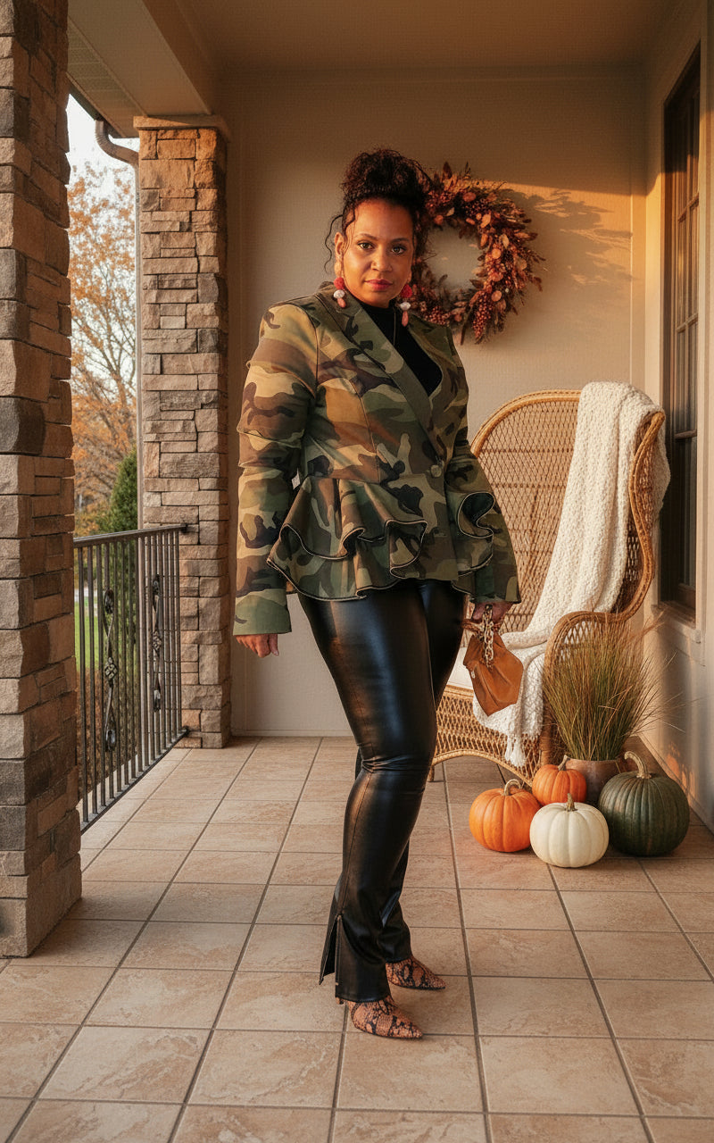 This plus size camouflage peplum blazer is a must-have for any stylish wardrobe. Crafted with high-quality material, inside lining, and featuring a double button closure, this blazer is both fashionable and functional. The zipper trim around the edge of the peplum adds a touch of edginess, making it a versatile piece for any occasion. Cotton material. Sleeves a perfect for long arms.
