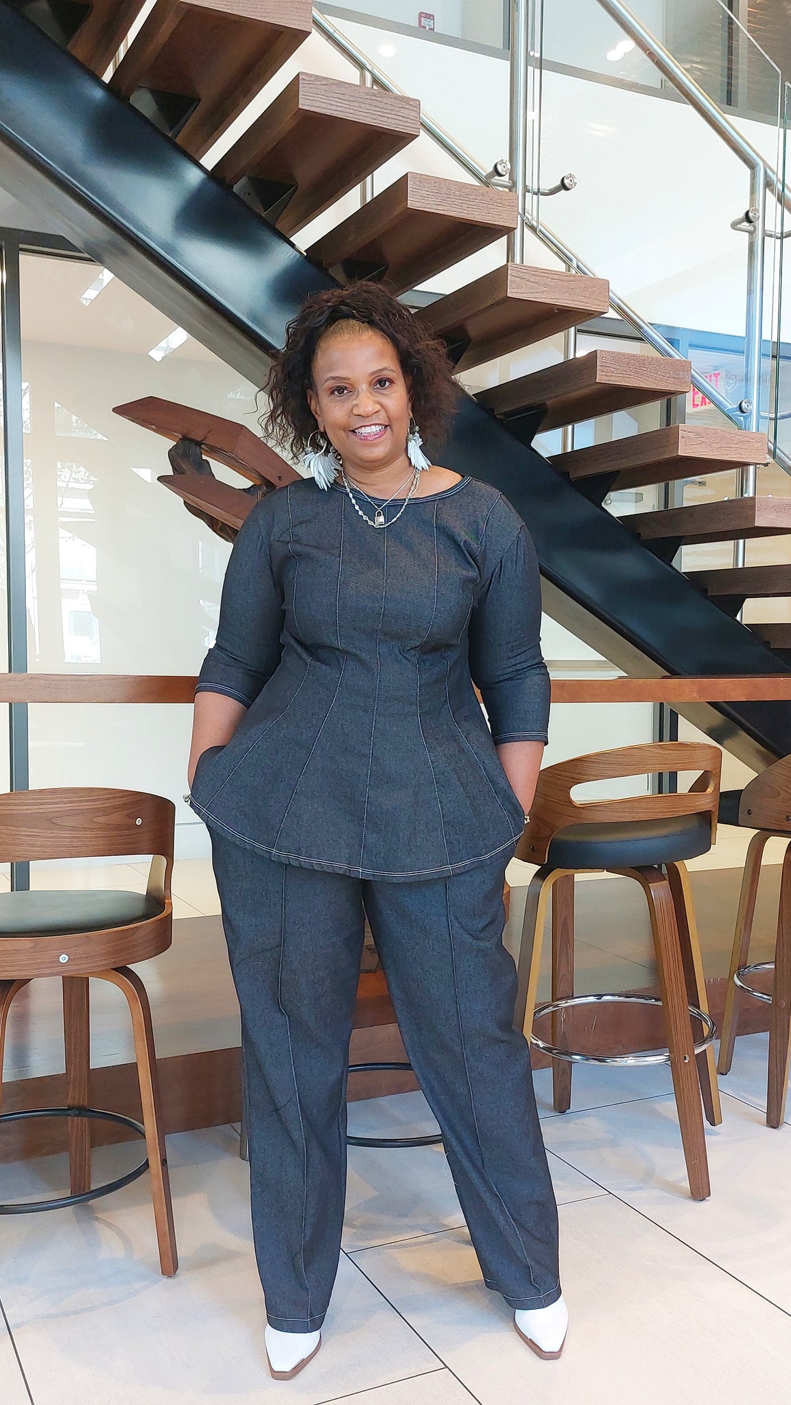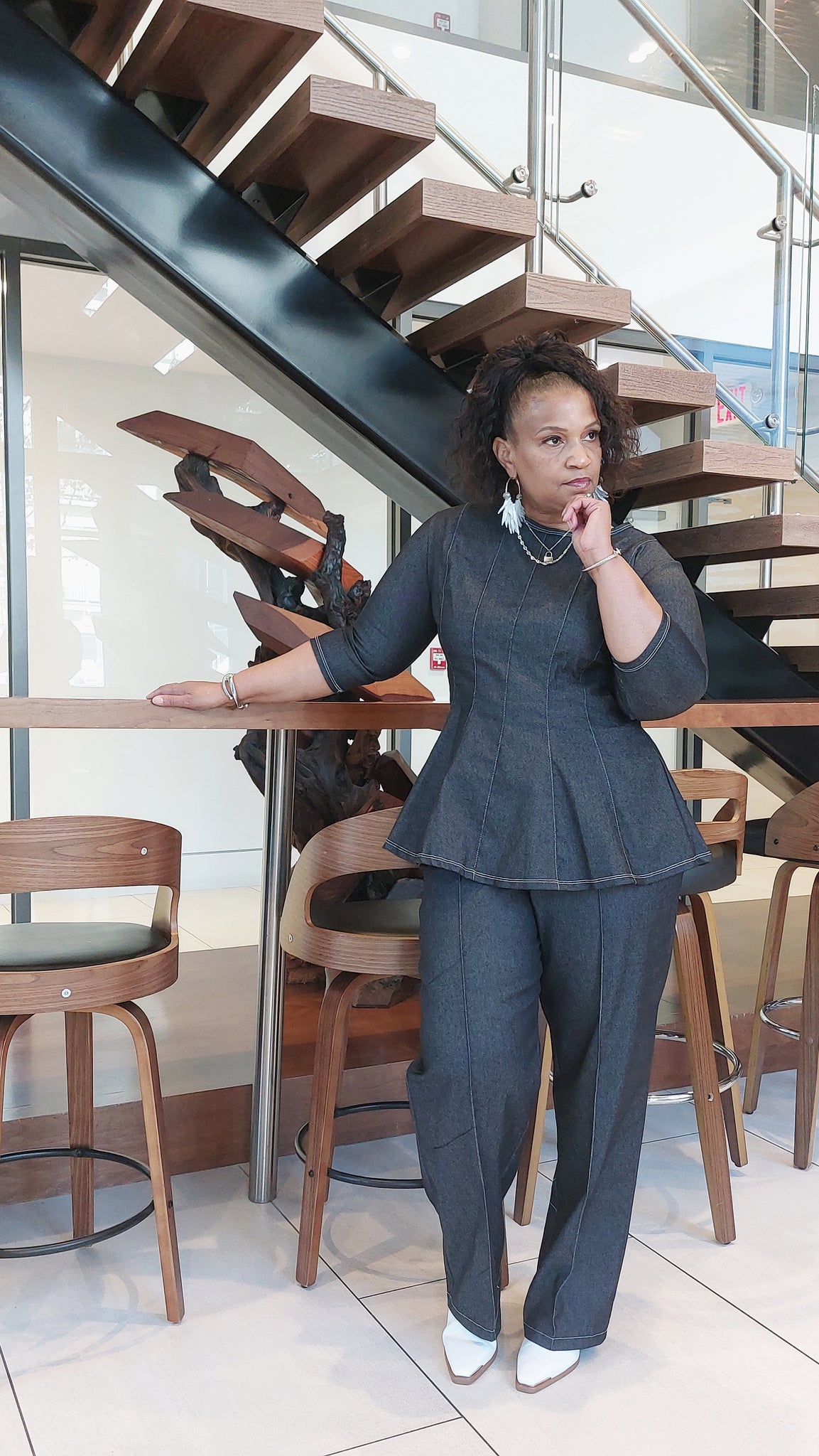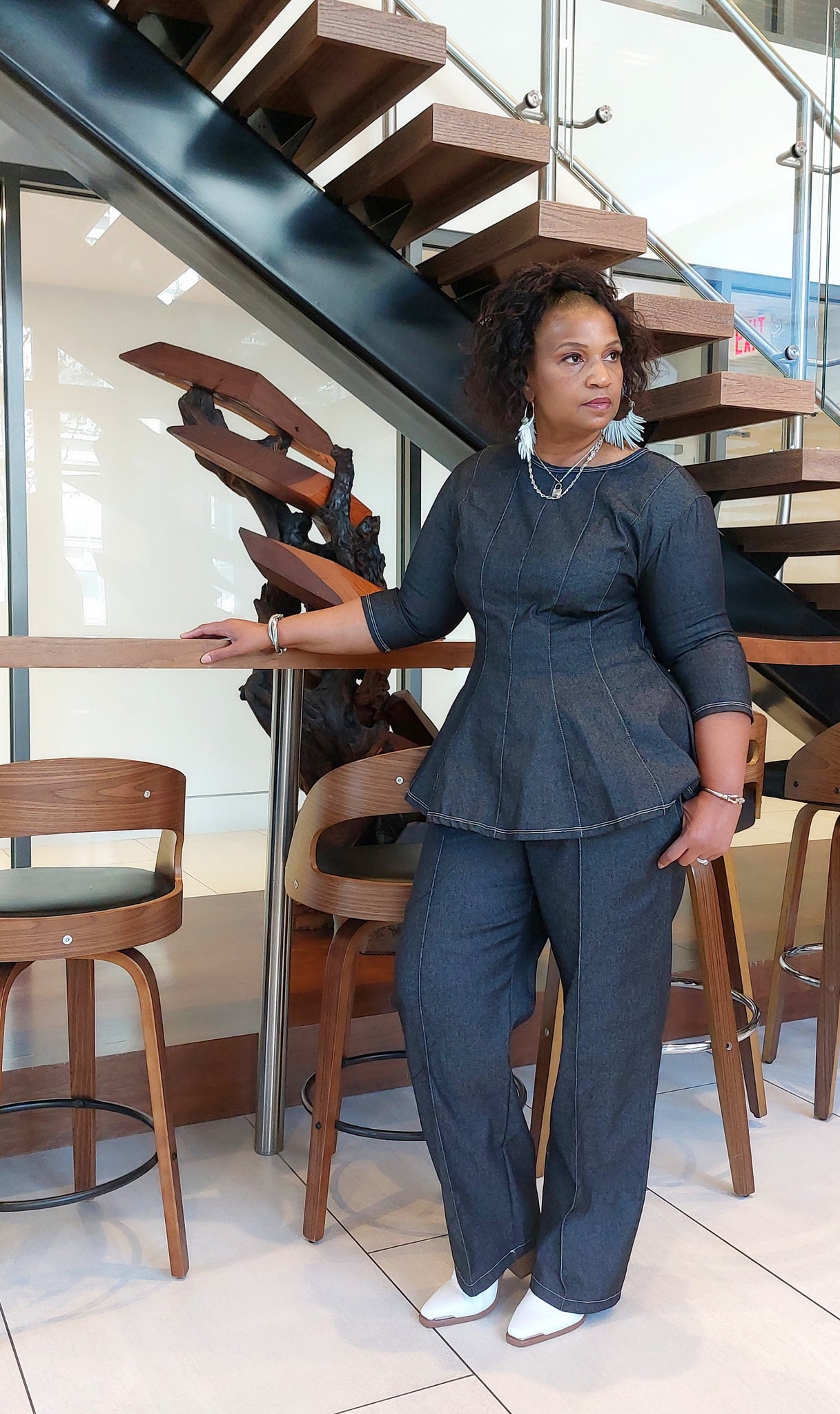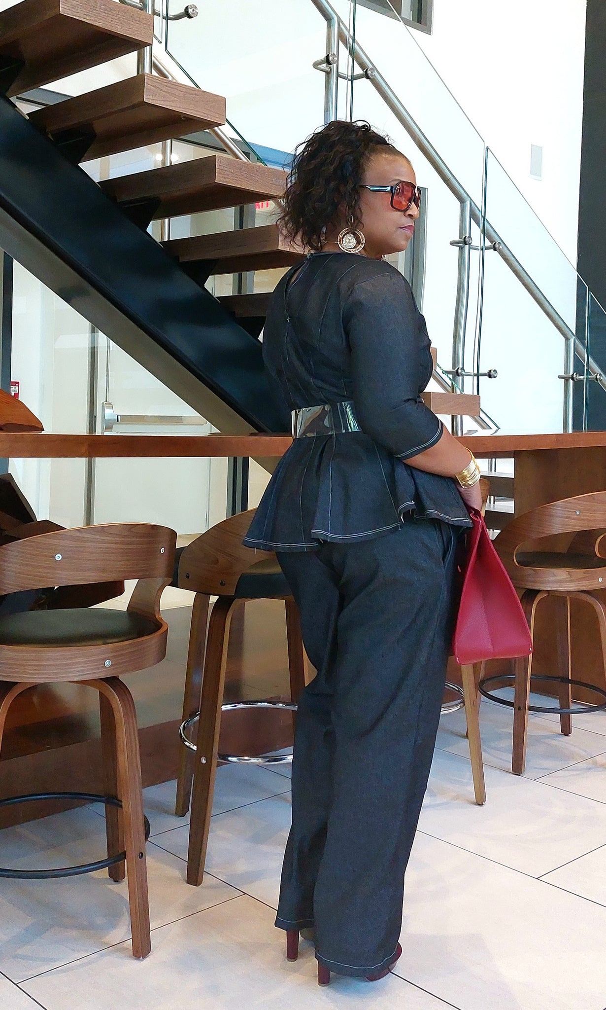 Our stitch denim peplum set Upgrade your denim game with our Stitch Denim Peplum Set, crafted with stretch fabric for a comfortable, flattering fit. The high waist and stretch waistband accentuate your curves while the dark wash adds a touch of sophistication. Made with 76% cotton, 21% polyester, and 3% spandex for ultimate comfort. Pockets included for added convenience. Belt not included.