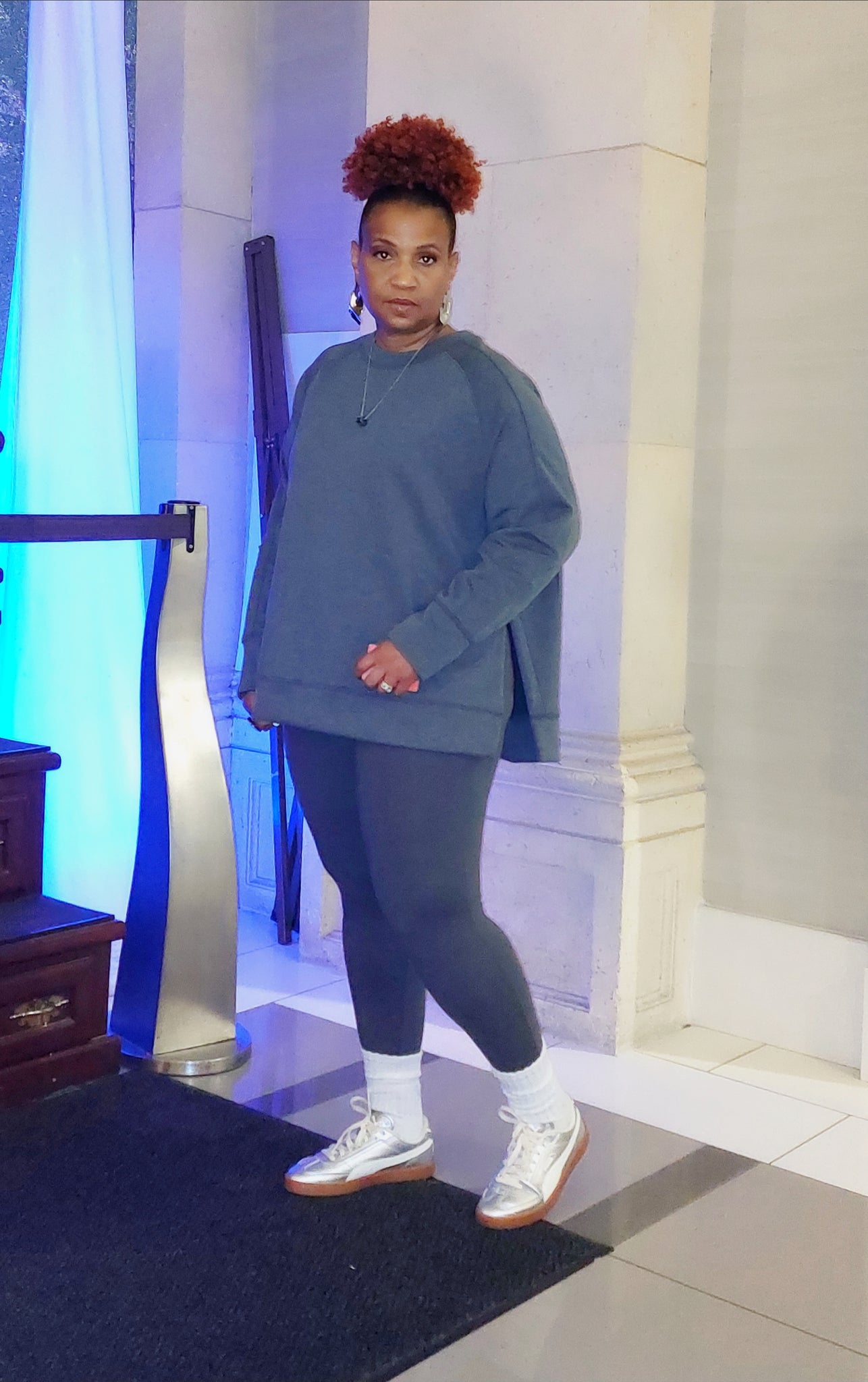 Material polyester, spandex. High waist legging with side slit scuba round neck