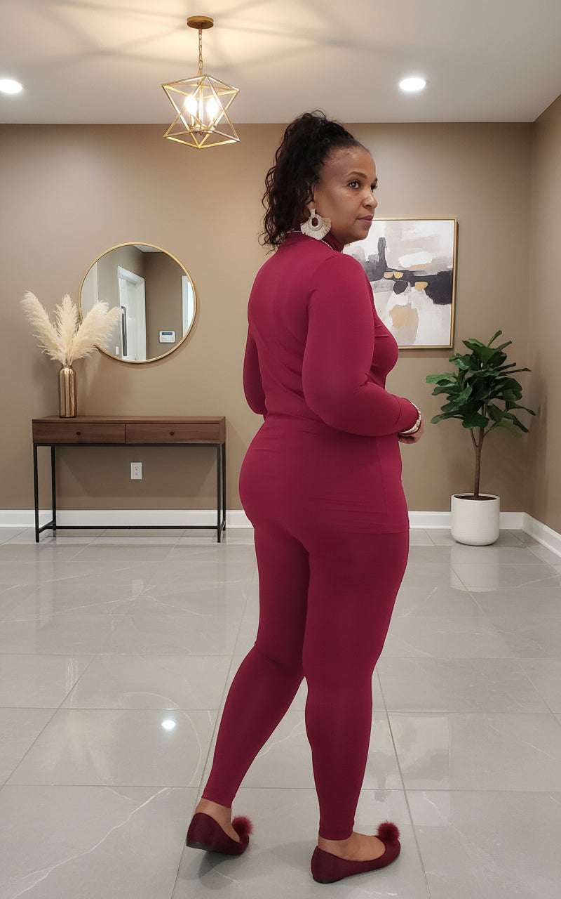 Our Everyday Basic mock neck set in burgundy color is the perfect combination of comfort and style. Made with high-quality stretch material, this basic set is perfect for lounging at home or running errands. 90% polyester,  10% spandex