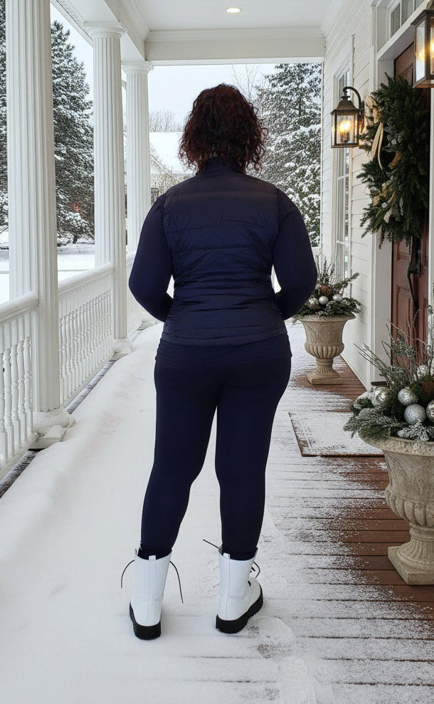Stay warm and stylish with our Black Puffer Vest. This light padded thermal jacket features a stand up collar and a lightweight design, providing both comfort and insulation. Pack bag is included. A front zipper and pockets add functionality, while the fitted design flatters your shape. Perfect for any outdoor adventure, this vest is a must-have for any wardrobe. Pair with our black basic set for a statement